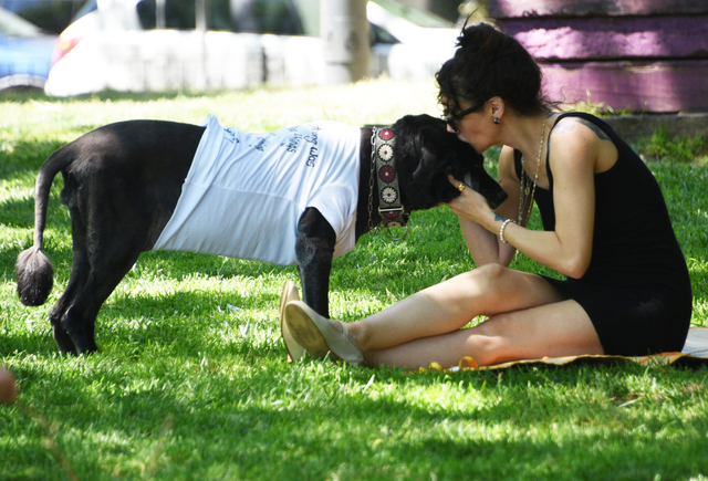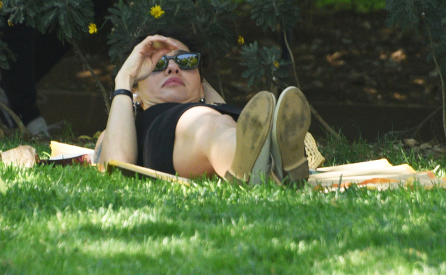 Köpeğini parkta oynatan Birce Akalay, bir ara çimlere uzanıp dinlendi.