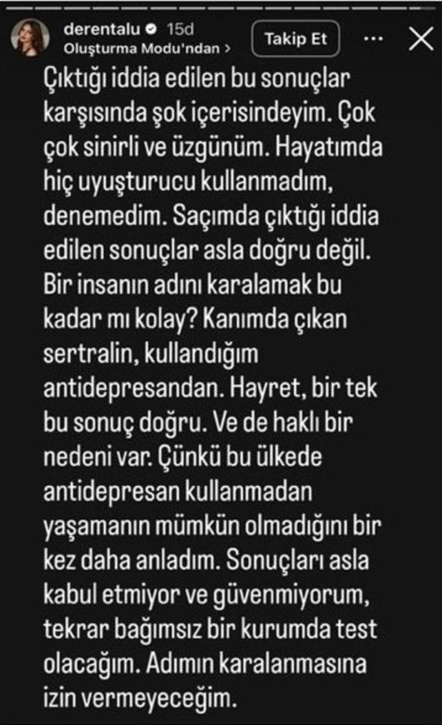 Uyuşturucu operasyonu kapsamında kan ve saç örneği alınan Defne Samyeli'nin kızı Deren Talu, pozitif çıkan test sonucuna tepki gösterdi.