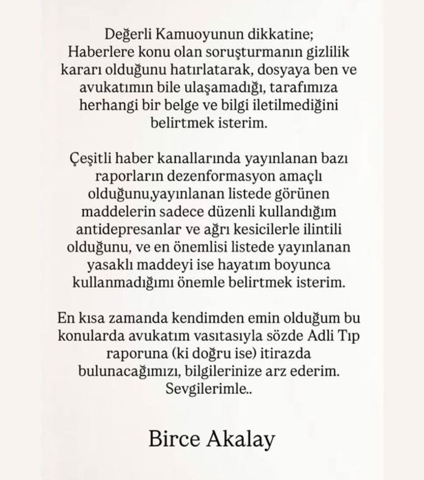 Akalay, şunları söyledi: Haberlere konu olan soruşturmanın gizlilik kararı olduğunu hatırlatarak, dosyaya ben ve avukatımın bile ulaşamadığı, tarafımıza herhangi bir belge ve bilgi iletilmediğini belirtmek isterim. Çeşitli haber kanallarında yayınlanan bazı raporların dezenformasyon amaçlı olduğunu, yayınlanan listede görünen maddelerin sadece düzenli kullandığım antidepresanlar ve ağrı kesicilerle ilintili olduğunu ve en önemlisi listede yayınlanan yasaklı maddeyi ise hayatım boyunca kullanmadığımı önemle belirtmek isterim. En kısa zamanda kendimden emin olduğum bu konularda avukatım vasıtasıyla sözde Adli Tıp raporuna (ki doğru ise) itirazda bulunacağımızı, bilgilerinize arz ederim. Sevgilerimle...