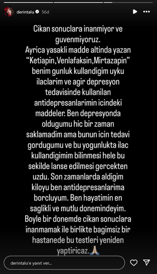 Ablası Deren Talu gibi testi pozitif çıkan Derin Talu da; "Çıkan sonuçlara inanmıyor ve güvenmiyoruz" diyerek, şu ifadeleri kullandı: Yasaklı madde altında yazan "Ketiapin, Venlafaksin, Mirtazapin" benim günlük kullandığım uyku ilaçlarım ve ağır depresyon tedavisinde kullanılan antidepresanlarımın içindeki maddeler. Ben depresyonda olduğumu hiçbir zaman saklamadım ama bunun için tedavi gördüğümü ve bu yoğunlukta ilaç kullandığımın bilinmesi hele bu şekilde lanse edilmesi gerçekten üzdü. Son zamanlarda aldığım kiloyu ben antidepresanlarima borçluyum. Ben hayatımın en sağlıklı ve mutlu dönemindeyim. Böyle bir dönemde çıkan sonuçlara inanmamak ile birlikte bağımsız bir hastanede bu testleri yeniden yaptıracağız.