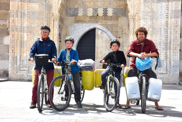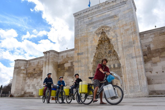 Fransa'dan 4 bisikletle yola çıkan 38 yaşındaki Pascal Servas ve ailesi, binlerce kilometre pedal çevirerek geldikleri tarihi Sultanhanı Kervansarayı'na hayran kaldı