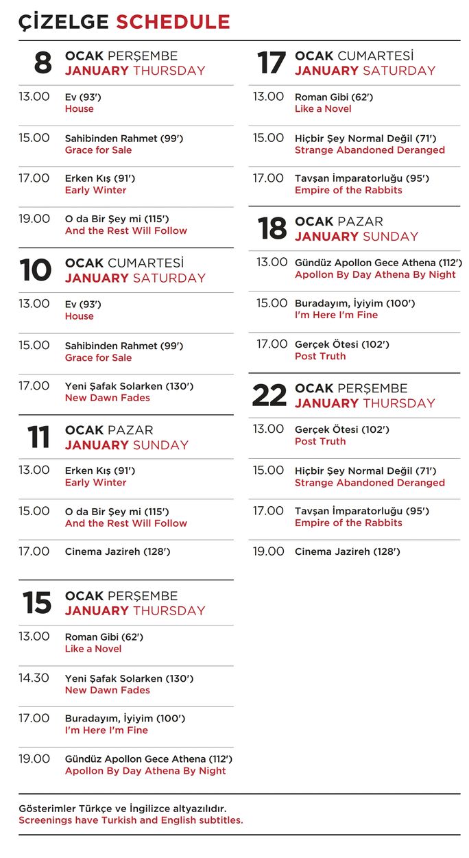 Bu yılın programında, Adana Altın Koza Film Festivali’nde Yılmaz Güney Ödülü’ne layık görülen Ev, Tokyo Film Festivali Asian Future bölümünde En İyi Film ve İstanbul Film Festivali’nde SİYAD En İyi Film Ödülü kazanan Gündüz Apollo, Gece Athena ile Antalya Altın Portakal Film Festivali’nde En İyi İlk Film ve En İyi Senaryo ödüllerinin sahibi Sahibinden Rahmet yer alıyor. Seçkide ayrıca, Altın Portakal’da En İyi Film dâhil yedi ödül kazanan Tavşan İmparatorluğu, İstanbul Film Festivali’nde En İyi Senaryo Ödülü’nü kazanan Pelin Esmer’in son filmi O da Bir Şey mi ve İstanbul Film Festivali’nde En İyi Yönetmen Ödülü’ne layık görülen Yeni Şafak Solarken de öne çıkan yapımlar arasında bulunuyor.