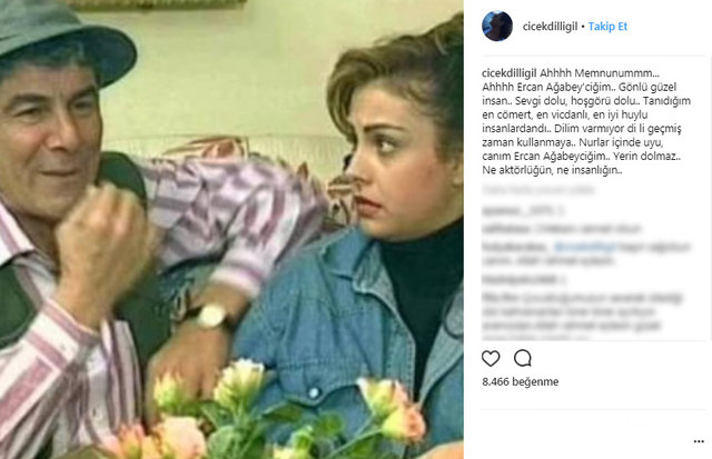 ÇİÇEK DİLLİGİL: Ah Memnunum… Ah Ercan ağabeyciğim… Gönlü güzel insan… Sevgi dolu, hoşgörü dolu… Tanıdığım en cömert, en vicdanlı, en iyi huylu insanlardandı… Dilim varmıyor -di li geçmiş zaman kullanmaya… Nurlar içinde uyu, canım Ercan ağabeyciğim… Yerin dolmaz… Ne aktörlüğün, ne insanlığın…
