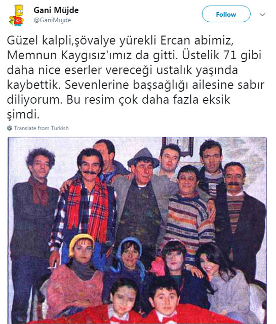 GANİ MÜJDE: Güzel kalpli, şövalye yürekli Ercan abimiz. Memnun Kaygısız'ımız da gitti. Üstelik 71 gibi daha nice eserler vereceği ustalık yaşında kaybettik. Sevenlerine başsağlığı ailesine sabır diliyorum. Bu resim çok daha fazla eksik şimdi...