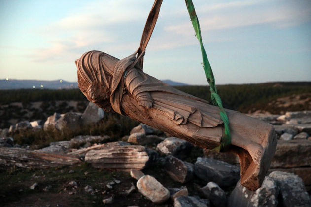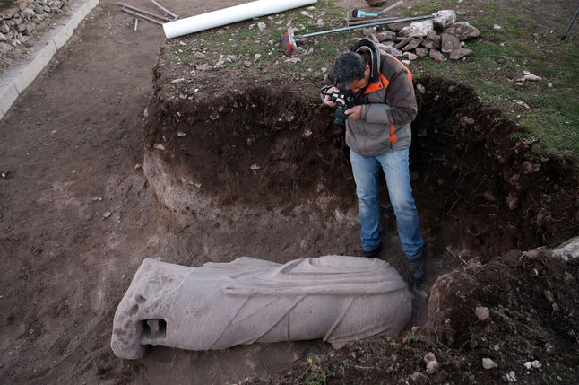 "Heykeller tapınak alanına mı ait cadde kenarındaki onurlandırma heykellerinden mi, bunları henüz bilmiyoruz. Çevresinde birkaç yazıt ele geçti ama bu yazıtların heykelle bir ilişkisinin olup olmadığını da henüz araştırıyoruz. Her ikisi de mermer erkek heykelleri. Bunlardan biri giyinik, başı dışında tam boy olarak ele geçti. Bu bakımdan şanslıyız. Baş kısmı bilerek oyulmuş. Belli ki daha sonra kendi portresini yaptıran birisi o kısma o portreyi yerleştiriyordu. Başı hariç korunan boyu yaklaşık 185 santimetre. Diğer heykel ise başı, sağ kolu ve iki bacağı eksik halde ele geçti. Sol kolundan dolanarak sol omuzunda toplanan kısa bir pelerine sahip. Bunların kim olduklarını, bir tanrı, imparator ya da bir devlet adamı olup olmadıklarını henüz netleştirmiş değiliz.