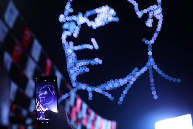 Havalanan yüzlerce drone ile gökyüzüne Türk Bayrağı, 100. yıl logosu, 29 Ekim 1923, Atatürk silüetleri çizildi.