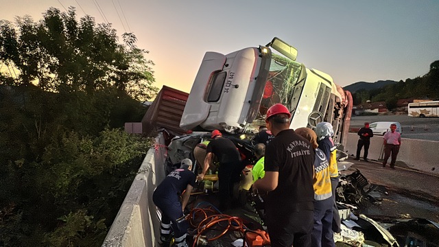 Bolu Dağı'da yolcu otobüsü ve hafif ticari araca çarpan TIR, kontrolden çıkarak bir otomobilin üzerine devrildi. Facidan dönülen kazada otomobil sürücüsü 2 saatlik çalışmanın ardından kurtarıldı. Kaza nedeniyle Bolu Dağı geçişinde uzun araç kuyrukları oluştu
