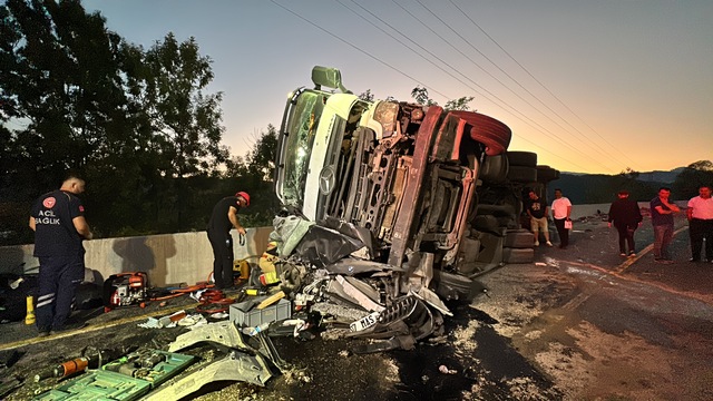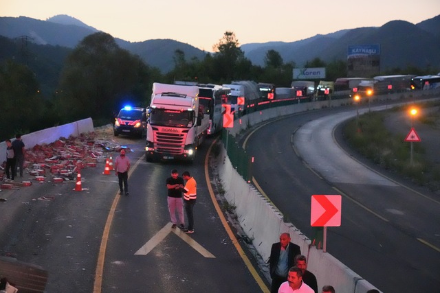 İstanbul istikametine giden Ertuğrul Uğur Kafraz idaresindeki makarna yüklü TIR, refüjde bulunan beton bariyerlere çarparak kontrolden çıktı.