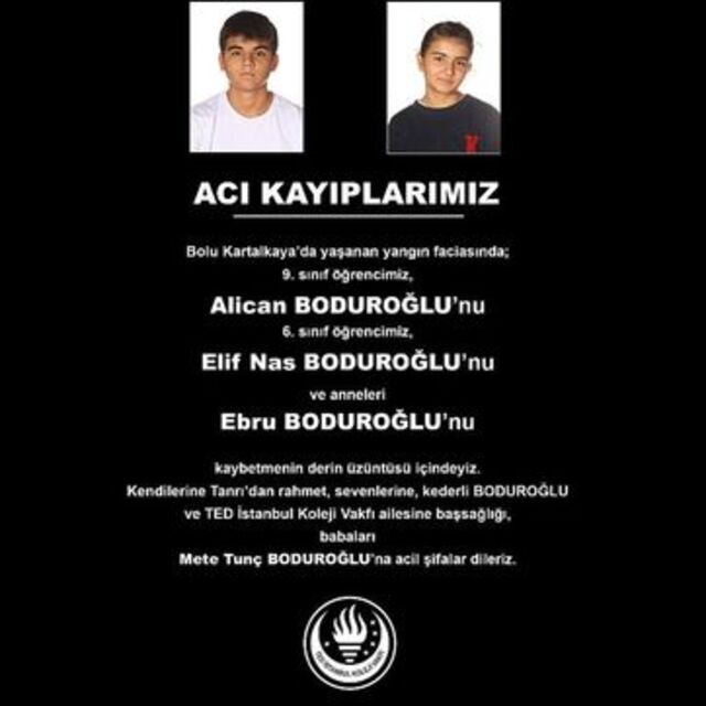ODTÜ Koleji'nden yapılan açıklamada, Bolu Kartalkaya kayak merkezinde çıkan otel yangınında 3'üncü sınıf öğrencisi Kemal Tokcan ve babası Can Tokcan ile ana sınıfı öğrencisi Atlas Kaan Tokcan ve babası Atil Enis Tokcan'ın hayatını kaybettiği bildirildi.