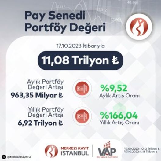 17 Ekim itibarıyla yatırımcıların borsadaki toplam portföy değeri ise 11.08 trilyon liraya ulaştı. Toplam portföy büyüklüğü aylık olarak 963.35 milyar TL, yıllık olarak ise 6.92 trilyon lira yükseldi.
