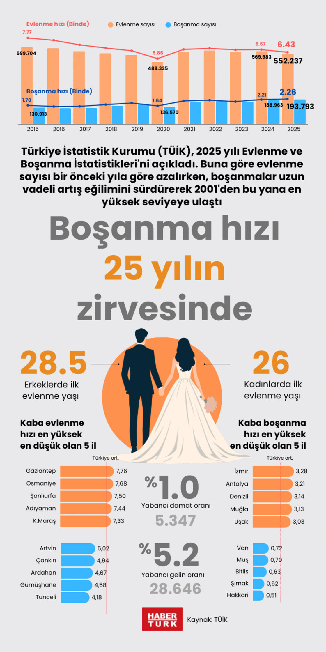Türkiye İstatistik Kurumu (TÜİK), 2025 yılı Evlenme ve Boşanma İstatistikleri'ni açıkladı. Buna göre, evlenen çiftlerin sayısı 2024 yılında 569 bin 983 iken 2025'te 552 bin 237'ye geriledi. Kaba evlenme hızı ise 2025'te binde 6,43 olarak kaydedildi. Evlenen çiftlerin sayısındaki düşüş, en son Covid-19 salgınının etkili olduğu 2020 yılında ve 2023'te görülmüştü.