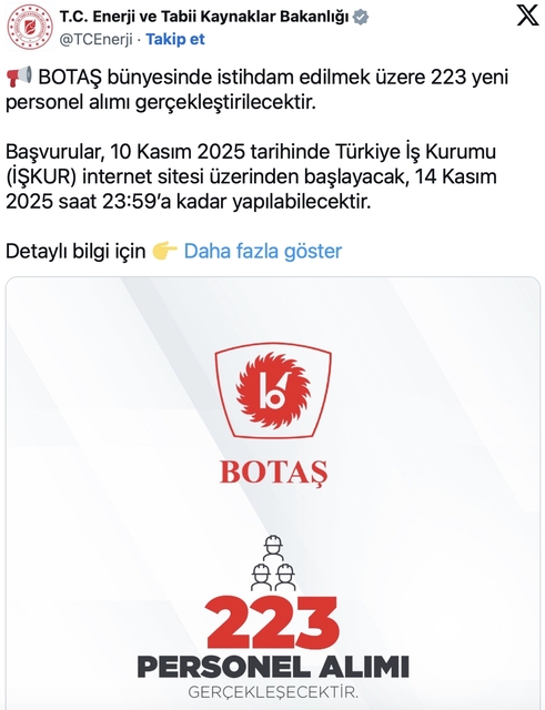 Bakanlığın sosyal medya hesabından yapılan açıklamada, "BOTAŞ bünyesinde istihdam edilmek üzere 223 yeni personel alımı gerçekleştirilecektir. Başvurular, 10 Kasım 2025 tarihinde Türkiye İş Kurumu (İŞKUR) internet sitesi üzerinden başlayacak, 14 Kasım 2025 saat 23.59'a kadar yapılabilecektir" denildi.