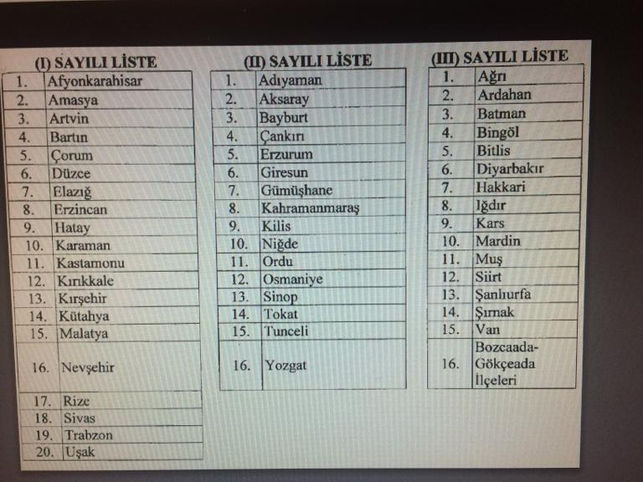• Ağrı, Ardahan, Batman, Bingöl, Bitlis, Diyarbakır, Hakkâri, Iğdır, Kars, Mardin, Muş, Siirt, Şanlıurfa, Şırnak, Van, Bozcaada-Gökçeada ilçeleri)