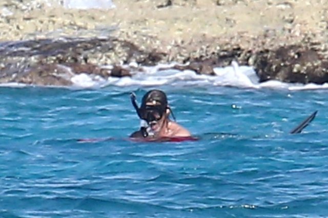 Bir ara şnorkelle objektiflere baktığı görülen ünlü oyuncunun sırtındaki dövmeler dikkat çekti.