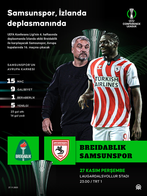 Samsunspor, UEFA Konferans Ligi'nin 4. haftasında İzlanda ekibi Breidablik ile karşılaşıyor. Konferans Ligi'nde yoluna 3'te 3 ile dolu dizgin devam eden Karadeniz ekibi, Breidablik karşısında iddiasını sürdürmek istiyor. Lougardalsvöllur Stadı'nda oynanacak mücadele öncesinde, Breidablik-Samsunspor maçının saati ve yayıncı kuruluşu futbolseverler tarafından araştırılmaya başlandı. Peki, "Breidablik-Samsunspor maçı saat kaçta, hangi kanalda?" İşte Breidablik-Samsunspor maçı canlı izle ekranı...