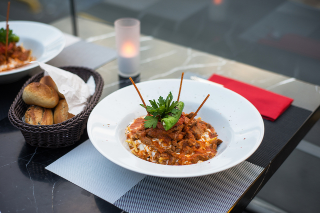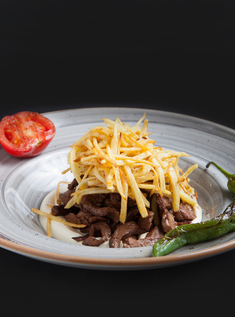 Daha sonra sarımsaklı yoğurdu patateslerin üzerinde gezdirin. İnceltilmiş ve bifteklik olarak doğradığınız eti, büyük bir tavada yüksek ateşte 5 dakika kadar kızartın.