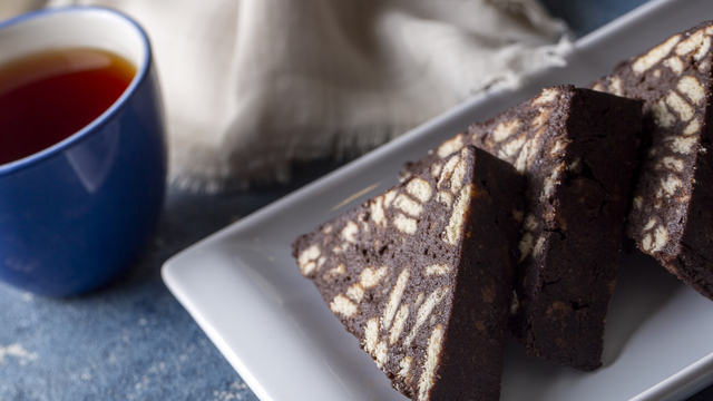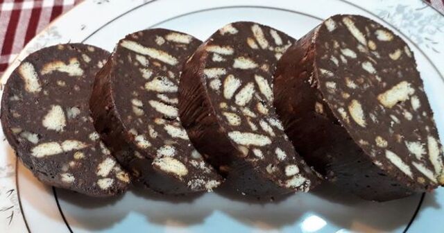 Tereyağını tavada eriterek başlayın, daha sonra büyük geniş bir kabın içinde eritilmiş tereyağını, sütü, şekeri ve kakaoyu homojen bir hale gelinceye kadar karıştırın. Bu karışımın üzerine bisküvileri kırarak ekleyin. Bu aşamada isterseniz karışıma ceviz ya da fındık ekleyebilirsiniz.