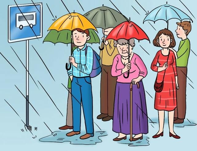 3. Yağmurlu bir günde otobüs durağında doğru olmayan bir şey var.