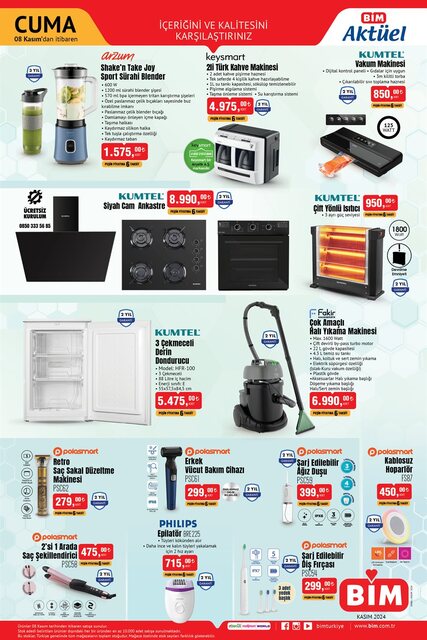 BİM, 6-8 Kasım 2024 aktüel kataloğunu yayınladı. Farklı kategoriden yüzlerce ürüne yer verilen aktüelde bu hafta; halı yıkama makinesi, beyaz eşya, masaj cihazı, şaç şekillendirici, tava-tencere gibi birçok ürüne yer verildi.