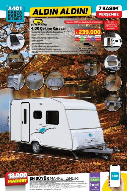 Yeni haftanın A101 aktüel ürünler kataloğunun ilk sayfasında çekme karavan yer aldı. 7 Kasım'dan itibaren geçerli olacak indirimler arasında benzinli motosiklet, buzdolabı, çay makinesi, gözleme sacı ve dikey şarjlı süpürge bulunuyor.