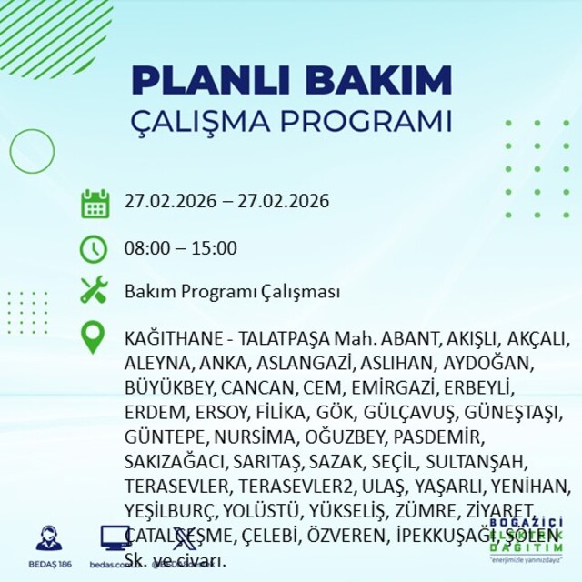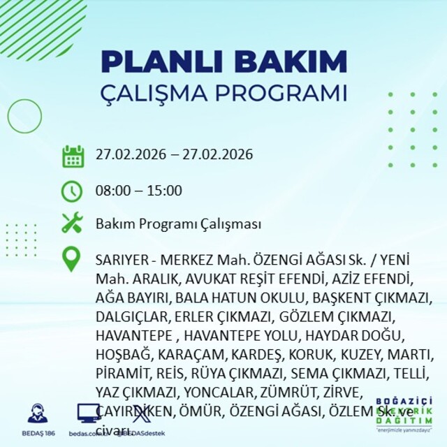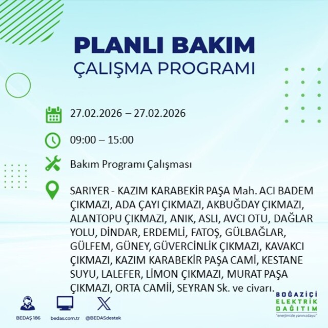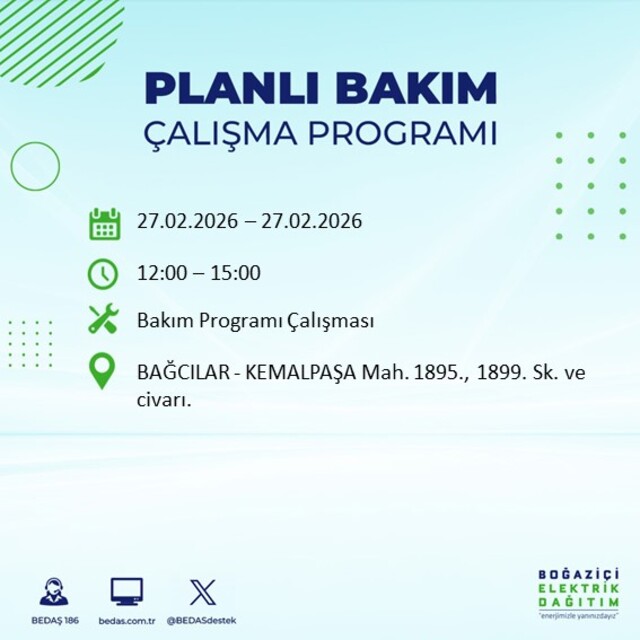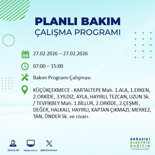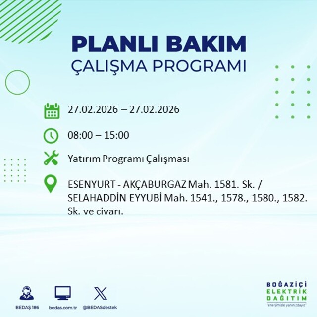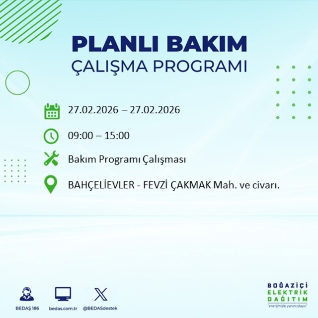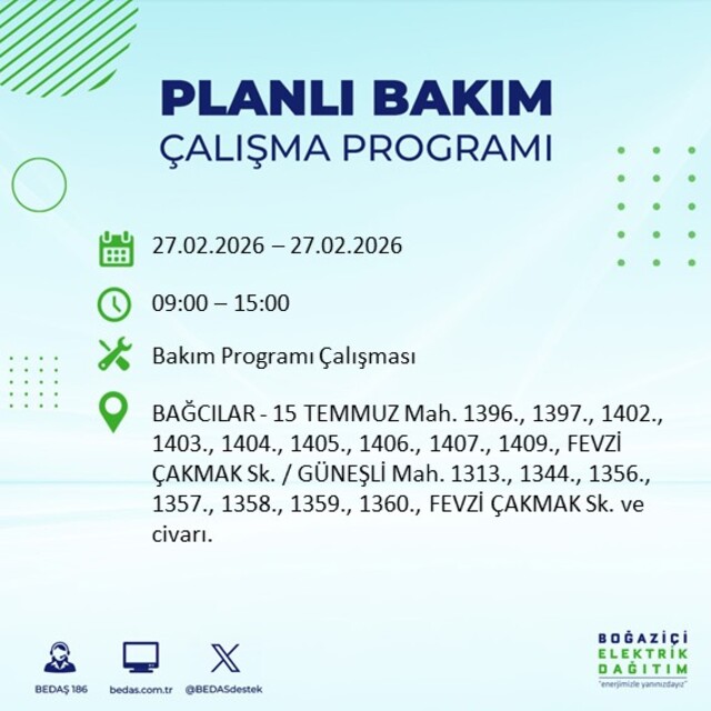 Boğaziçi Elektrik Dağıtım A.Ş tarafından yapılan duyuruya göre 27 Şubat 2026 Cuma İstanbul'da farklı saat aralıklarında elektrik kesintileri uygulanacak.