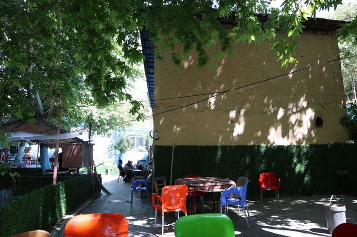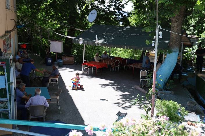 Dağlardan gelen suyun bahçede oluşturduğu havuzu başta olmak üzere doğası ve yapısıyla huzur veren kahvehaneye gelen vatandaşlar, oturdukları yerde uykuya dalıyor.