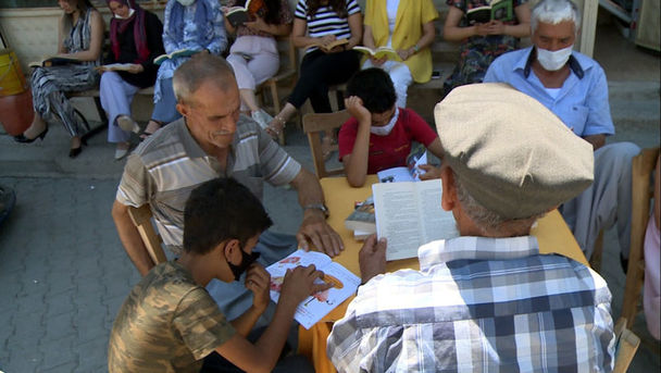 Mersin'in merkez Toroslar ilçesine bağlı Musalı Mahallesi'nde genç yaşlı herkes 3 yıldır her salı günü meydanda toplanarak 1 saat kitap okuyor.