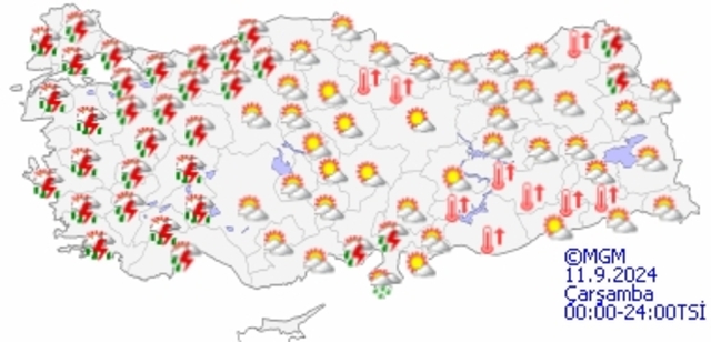 Meteoroloji Genel Müdürlüğü tarafından yapılan son tahminlere göre önümüzdeki 24 saat: Ülkemizin batı kesimleri ile kuzeydoğusunun yer yer çok bulutlu, Marmara, Ege, Batı Akdeniz, İskenderun Körfezi çevreleri, İç Anadolu'nun batısı ve Doğu Anadolu’nun doğusunun yerel sağanak ve gök gürültülü sağanak yağışlı, diğer yerlerin parçalı ve az bulutlu geçeceği tahmin ediliyor. Yağışların, Marmara ve Ege'nin batısı ile Batı Akdeniz'in iç kesimlerinde yer yer kuvvetli, İzmir çevrelerinde yer yer çok kuvvetli olması bekleniyor.