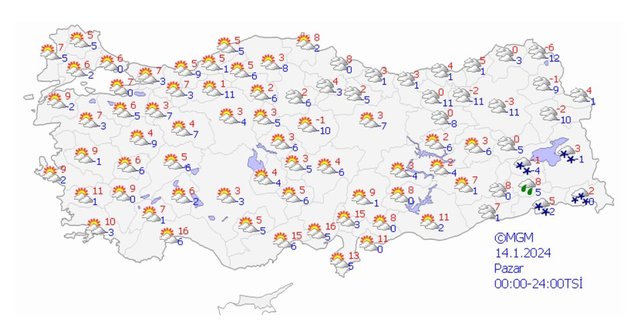 14 Ocak Pazar günü yurt genelinde karlı hava yerini güneşe bırakacak. Türkiye genelinde sıcaklıklar yükselmese de güneş kendini bulutların ardından gösterecek. Meteorolojinin tahminlerine göre; Pazar günü yalnızca Şırnak, Hakkari, Van ve Bitlis'te kar yağışı beklenirken; Siirt yağmurlu bir güne uyanacak.