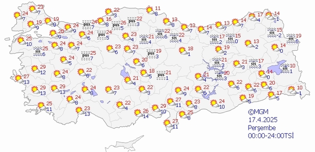 Meteoroloji Genel Müdürlüğü tarafından yapılan tahminlere göre: Ülkemizin kuzey ve doğu kesimlerinin parçalı ve yer yer çok bulutlu, Artvin, Bitlis ve Van çevreleri ile Iğdır'ın, Ağrı'nın ve Hakkari'nin doğu kesimlerinin yağışlı, diğer yerlerin az bulutlu ve açık geçeceği tahmin ediliyor. Yağışların genellikle yağmur ve sağanak, Hakkari'nin doğu kesimlerinde karla karışık yağmur ve kar şeklinde olması bekleniyor. Gece ve sabah saatlerinde kuzey, iç ve doğu kesimlerde pus ve yer yer sis hadisesinin görüleceği tahmin ediliyor. Trakya ile Kuzey Ege kıyılarında toz taşınımı bekleniyor.