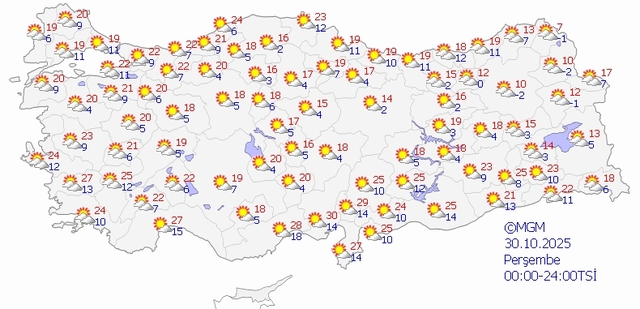 Meteoroloji Genel Müdürlüğü tarafından yayımlanan son hava raporuna göre, yurt genelinde parçalı bulutlu havanın hakim olması bekleniyor. Hava sıcaklığının yurdun batı ve iç kesimlerinde mevsim normallerinin 3 - 5 derece üzerinde, doğu kesimlerinde normalleri civarında seyredeceği tahmin ediliyor. Peki, "Bugün hava nasıl olacak?" İşte 30 Ekim 2025 Perşembe İzmir, Ankara, İstanbul hava durumu...