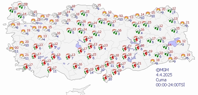 Nisan ayının gelişiyle birlikte Türkiye'nin tamamı sağanak yağmurun etkisi altına girdi. Meteoroloji Genel Müdürlüğü tarafından yapılan tahminlere göre: ülke genelinin parçalı ve çok bulutlu, hava sıcaklıklarında önemli bir değişiklik olmayacağı, ülke genelinde mevsim normalleri civarında seyredeceği tahmin ediliyor. Peki, "Bugün hava nasıl olacak?" İşte 4 Nisan Cuma İstanbul, İzmir, Ankara hava durumu tahminleri...