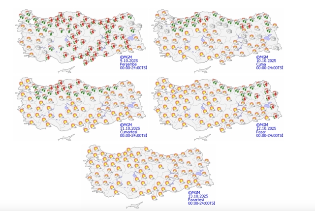 Meteoroloji Genel Müdürlüğü tarafından yapılan tahminlere göre: Ülkemiz genelinin parçalı ve çok bulutlu, Marmara'nın kuzey ve doğusu, Akdeniz, İç Anadolu, Karadeniz, Doğu Anadolu'nun kuzey ve batısı, Güneydoğu Anadolu'nun batısı ile Çanakkale, Kütahya, Bitlis ve Van çevrelerinin sağanak ve yer yer gök gürültülü sağanak yağışlı geçeceği tahmin ediliyor. Yağışların, Doğu Akdeniz'in iç kesimleri, Doğu Karadeniz kıyıları, Zonguldak, Bartın, Ordu ve Erzincan çevreleri ile Kayseri ve Sivas'ın doğu ilçelerinde yerel kuvvetli olması bekleniyor.