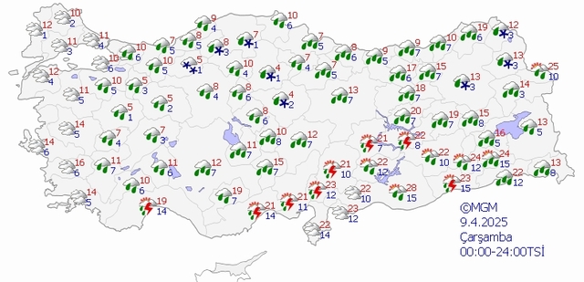 Meteoroloji Genel Müdürlüğü tarafından yapılan tahminlere göre: Ülkemiz genelinin parçalı ve çok bulutlu, Güney ve İç Ege, Akdeniz, İç Anadolu, Karadeniz ve Doğu Anadolu ile Güneydoğu Anadolu'nun kuzey ve doğusunun yağışlı geçeceği tahmin ediliyor. Yağışların genellikle yağmur ve sağanak, güney ve doğu kesimlerde yer yer gök gürültülü sağanak, Karadeniz’in iç kesimlerinin yüksekleri ve Doğu Anadolu'nun kuzeyinin yükseklerinde karla karışık yağmur ve kar şeklinde olması bekleniyor. Yağışların İç Anadolu'nun doğusu, Orta Karadeniz, Doğu Karadeniz'in doğusu ve Doğu Anadolu'nun kuzeybatı ve güneydoğusunda yer yer kuvvetli olacağı tahmin ediliyor. Doğu Anadolu'nun güneydoğusu ve Güneydoğu Anadolu'da toz taşınımı bekleniyor.