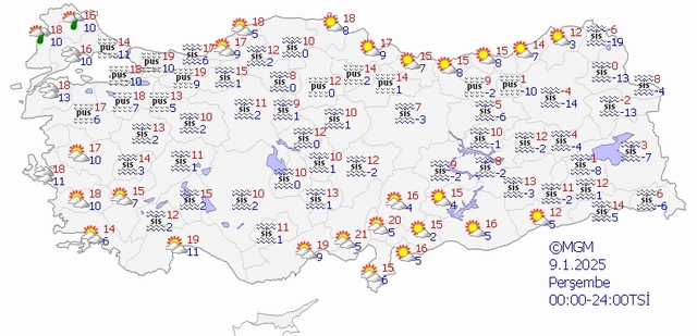 Meteoroloji Genel Müdürlüğü 9 Ocak Perşembe günü hava durumu raporunu yayınladı. Doğu Karadeniz'in iç kesimlerinin yüksekleri ile Doğu Anadolu'nun doğusunun dik ve eğimli yamaçlarında çığ tehlikesi ile iç ve doğu kesimlerinde buzlanma ve don olayı beklendiğinden ulaşımda meydana gelebilecek olumsuzluklara karşı dikkatli ve tedbirli olunması gerekmektedir. İşte 9 Ocak 2025 Perşembe MGM ile İstanbul, Ankara, İzmir hava durumu tahmini