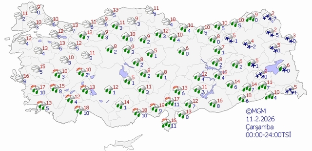 Meteoroloji Genel Müdürlüğü'nden yapılan açıklamaya göre, Van'ın kuzey ve güney ilçeleri, Hakkari'nin ve Şırnak'ın doğu kesimlerinin yükseklerinde kuvvetli karla karışık yağmur ve kar bekleniyor. Hava sıcaklığının ise, kuzey ve batı kesimlerde 3 ila 5 derece artacağı, diğer yerlerde önemli bir değişiklik olmayacağı, Ülke genelinde mevsim normallerinin üzerinde seyredeceği tahmin ediliyor. Peki, "Bugün hava nasıl olacak?" İşte 11 Şubat Çarşamba MGM ile hava durumu raporu...