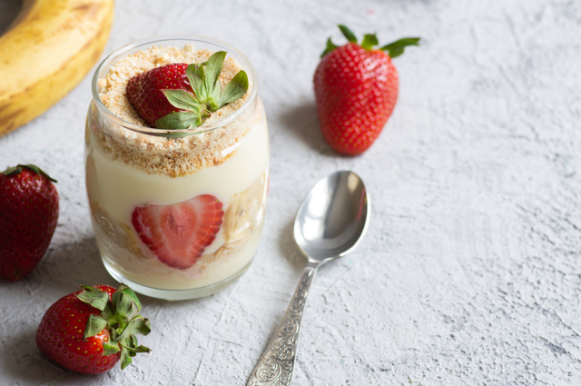 Servis kuplarının tabanına önce 1-2 yemek kaşığı toz bisküvi koyun. Kupların iç kenarlarına dilimlenmiş çilekleri dizin.