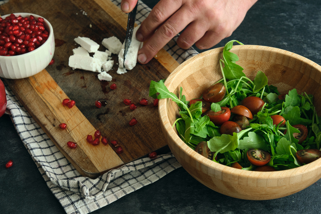 Rokaları bol suda yıkayıp sularını tamamen süzün. Kararmamaları için bıçak kullanmadan elinizle iri parçalar halinde kopararak salata kasesine alın. Üzerine ayıkladığınız nar tanelerini ve iri kırılmış ceviz içini serpiştirin.