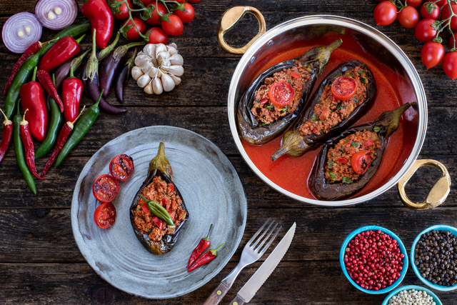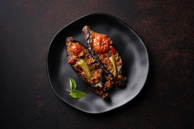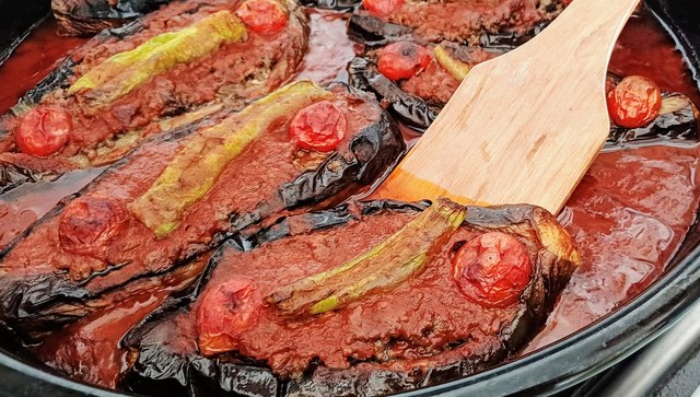 Kızaran patlıcanları fırın tepsisine dizin. Çizik attığınız yerleri kaşıkla hafifçe açıp hazırladığınız kıymalı harcı içlerine tepeleme doldurun. Patlıcanların üzerini kalan domates ve biber dilimleriyle süsleyin. Salça ve sıcak suyu karıştırıp tepsinin tabanına dökün. Önceden ısıtılmış 200 derece fırında yaklaşık 25-30 dakika pişirin.