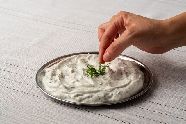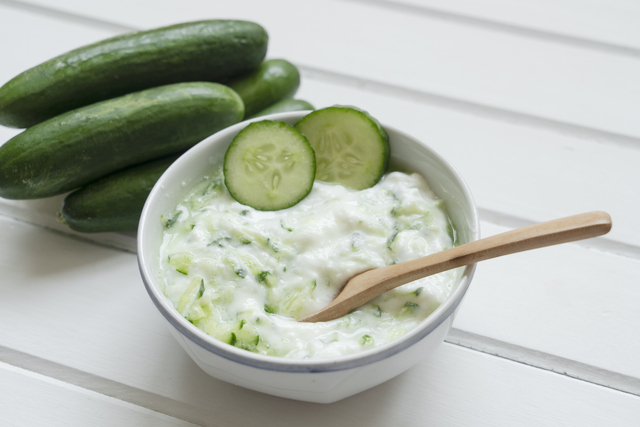 Salatalıkların kabuklarını soyun ve rendenin iri tarafıyla rendeleyin. Rendelenmiş salatalıkların fazla suyunu avucunuzla sıkarak iyice süzün. Derin bir kasede süzme yoğurt, ezilmiş sarımsak ve tuzu tamamen pürüzsüz olana kadar çırpın.