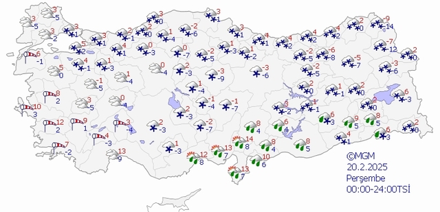 Meteoroloji Genel Müdürlüğü tarafından yapılan tahminlere göre: Ülkemiz genelinin parçalı ve çok bulutlu, Marmara(Çanakkale hariç), İç Ege, Orta ve Doğu Akdeniz, İç Anadolu, Karadeniz, Doğu ve Güneydoğu Anadolu ile Isparta çevrelerinin aralıklı yağışlı geçeceği tahmin ediliyor. Yağışların Orta ve Doğu Akdeniz, Güneydoğu Anadolu ile akşam saatlerine kadar Orta ve Doğu Karadeniz kıyılarında yağmur ve sağanak, yağış alan diğer yerlerde karla karışık yağmur ve kar şeklinde olması bekleniyor. Yağışların Doğu Karadeniz, Doğu Anadolu'nun batısı ile Kırklareli, Adana'nın güneyi, Hatay, Muş'un batı kesimleri, Ardahan, Kars ve Erzurum çevrelerinde kuvvetli olacağı tahmin ediliyor. Ülkemizin kuzey, iç ve doğu kesimlerde buzlanma ve don olayı bekleniyor. Doğu Karadeniz’in iç kesimlerinin yüksekleri ile Doğu Anadolu’nun yüksek ve dik yamaçlarında çığ tehlikesi bulunmaktadır.