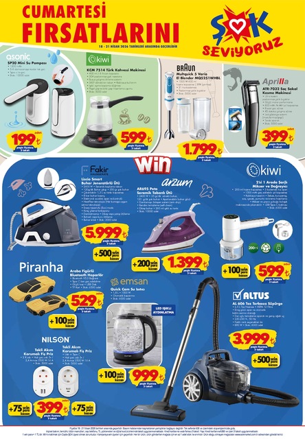 ŞOK marketin 18 Nisan aktüel broşürü belli oldu. Bugünden itibaren tüm ŞOK marketlerde mini su pompası, türk kahvesi makinesi, bluetooth hoparlör, toz torbasız süpürge, plastik kollu sandalye, tabure, çiçek toprağı, el blender, saç sakal kesme makinesi gibi çeşitli ürünler raflarda yerini alacak. İşte ŞOK marketin Cumartesi fırsatları 18 Nisan 2026 aktüel kataloğu haberimizde...