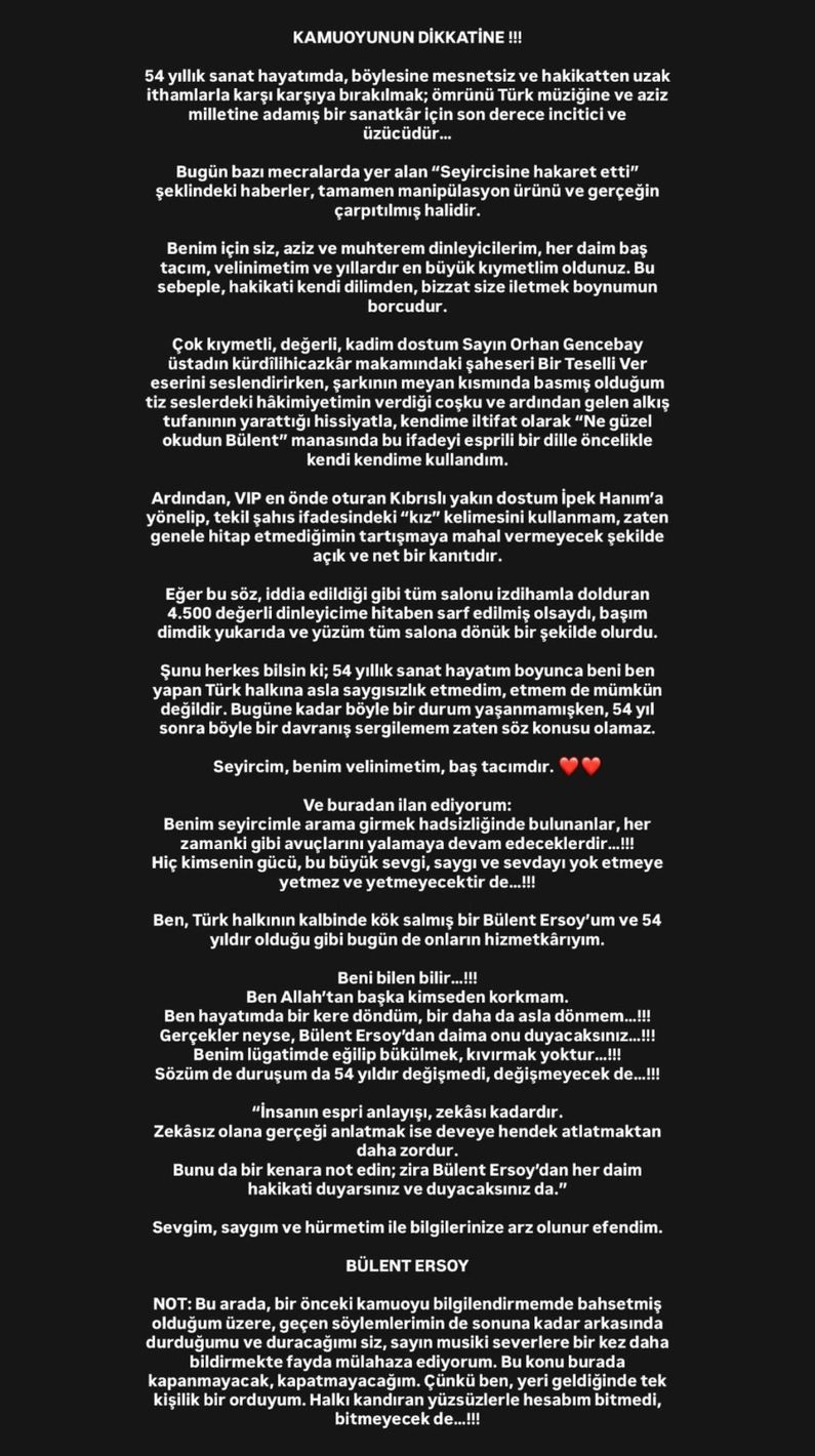 Bülent Ersoy, bulunduğu paylaşımda şu ifadelere yer verdi; "54 yıllık sanat hayatımda, böylesine mesnetsiz ve hakikatten uzak ithamlarla karşı karşıya bırakılmak; ömrünü Türk müziğine ve aziz milletine adamış bir sanatkâr için son derece incitici ve üzücüdür. Bugün bazı mecralarda yer alan, "Seyircisine hakaret etti" şeklindeki haberler, tamamen manipülasyon ürünü ve gerçeğin çarpıtılmış halidir. Benim için siz, aziz ve muhterem dinleyicilerim, her daim baş tacım, velinimetim ve yıllardır en büyük kıymetlim oldunuz. Bu sebeple, hakikati kendi dilimden, bizzat size iletmek boynumun borcudur.