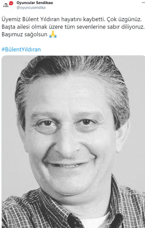 Pek çok dizi ve filmde rol alan usta oyuncu Bülent Yıldıran vefat etti. Acı haberi Oyuncular Sendikası duyurdu. Yapılan açıklamada, "Üyemiz Bülent Yıldıran hayatını kaybetti. Çok üzgünüz. Başta ailesi olmak üzere tüm sevenlerine sabır diliyoruz. Başımız sağ olsun." denildi.
