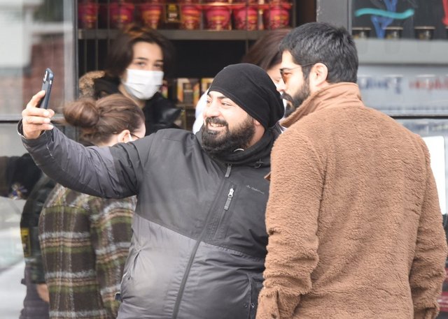 Ünlü oyuncu, mekan önünde hayranların gelen fotoğraf teklifini geri çevirmedi.