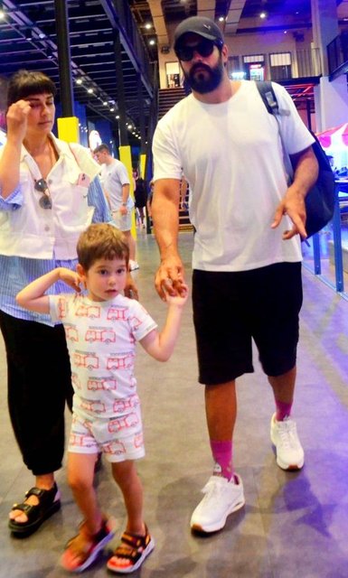 Karan ile birlikte gazetecilerin objektiflerine poz vermeyi ihmal etmeyen ünlü isim, daha sonra oğluyla birlikte oyun oynamaya gitti.