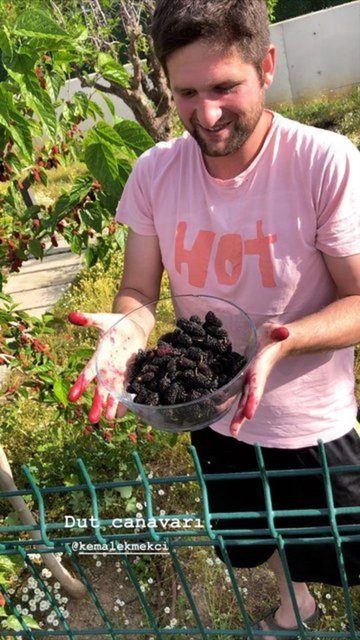 Öte yandan Karaca, bahçesinden dut toplayan eşi Kemal Ekmekçi'nin pozunu sosyal medya hesabından "Dut canavarı" notuyla yayınladı.