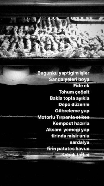 Bugünkü yaptığım işler; sandalyeleri boyamak, fide ekmek, tohum çoğaltmak, bakla toplayıp ayıklamak, depo düzenlemek, gübreleme yapmak, motorlu tırpanla et kesmek, komposto hazırlamak, akşam yemeği yapmak, fırında mısır unlu sardalya, fırın patates ve kabak tatlısı...