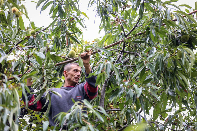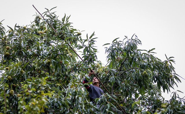 Bursa'da, 15 gün süren kestane hasadı döneminde boyu 35 metreyi bulan ağaçlara çıkıp ellerindeki sırıklarla kestane düşüren "dokuyucu"lar, meşakkatli ve tehlikeli olan bu işte 250 liraya varan yevmiye alıyor