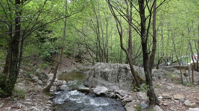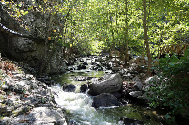 İHA'nın haberine göre Orhaneli ilçe merkezine 6 kilometre mesafedeki kanyonda tahta merdivenleri aşıp bendin üzerine çıkan ziyaretçileri yüksekliği 70 metreyi bulan kayalar karşılıyor.